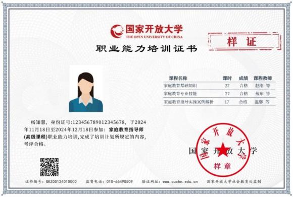 通过国家开放大学组织的家庭教育职业能力考核并通过后,发放《家庭教育指导师(高级课程)》职业能力培训证书。