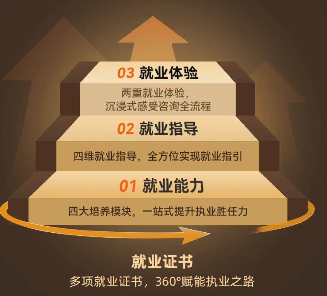 该模型以学员为中心,从零基础入门开始,逐步引导学员掌握核心技能、拓展职业领域、参与实战演练并接受个性化就业指导。通过循序渐进的学习过程,学员将能够稳步提升自己的专业能力与职业素养,为成功就业做好充分准备。同时,我们还将为学员提供真实的就业体验与专属的就业通道,助力学员快速成长为咨询精英。